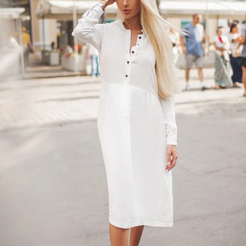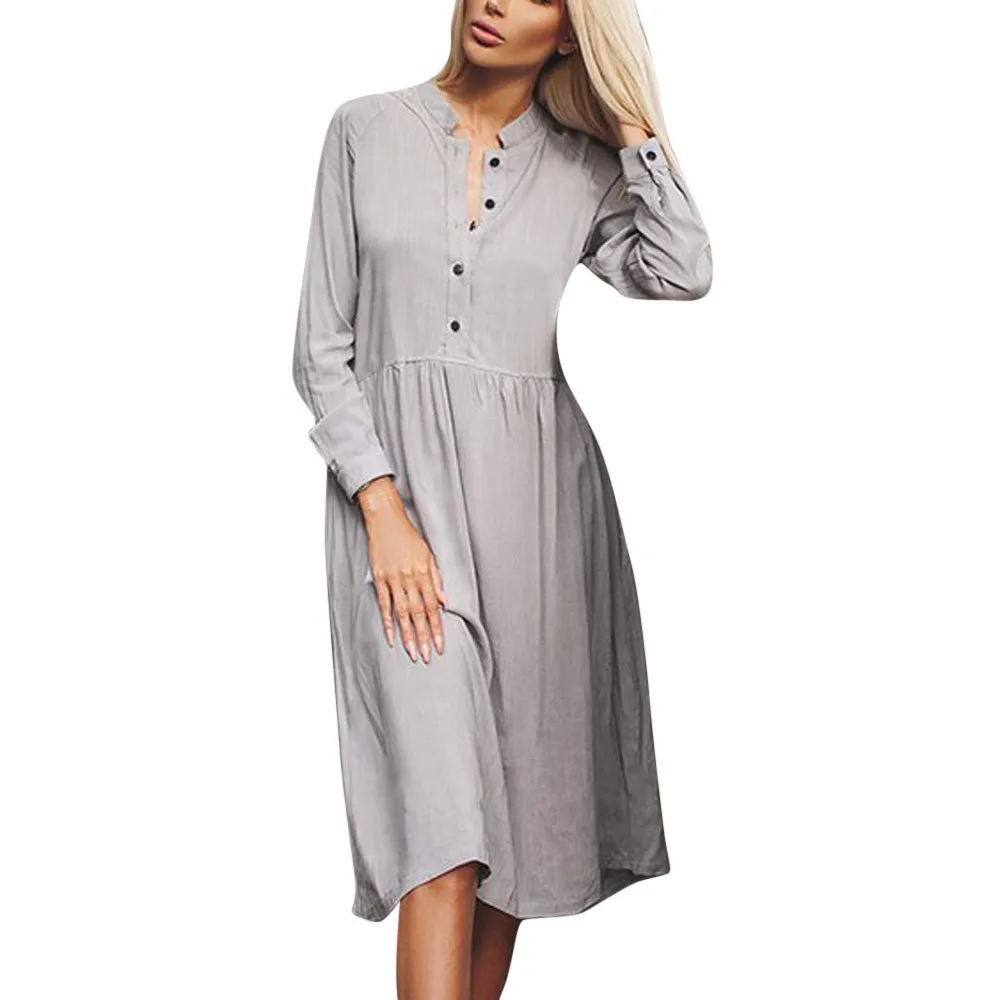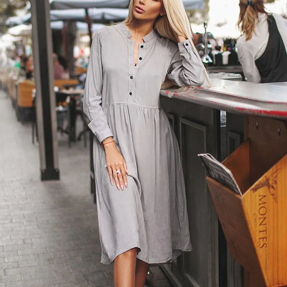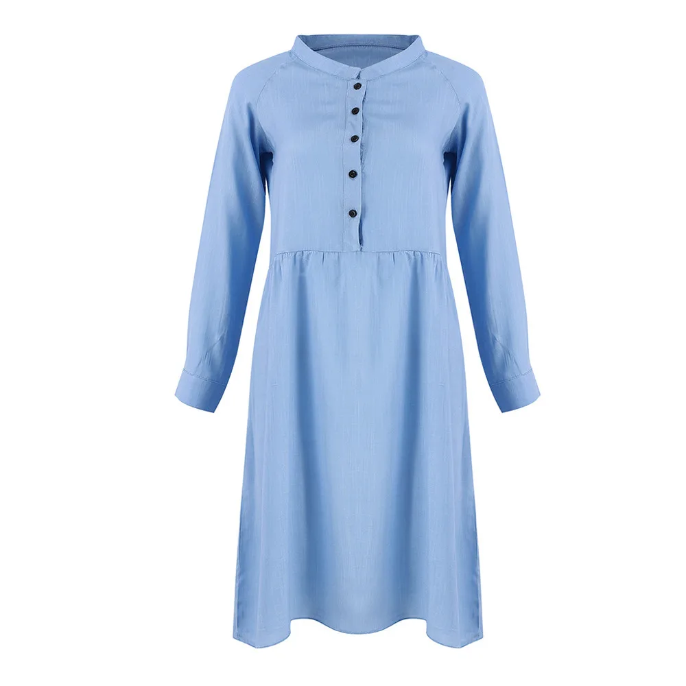 Fashion Women Botton England Solid Dresses Casual Elegant Sweet Long Sleeve Stand Collar Shirt Dress