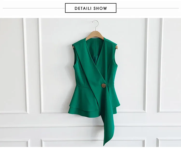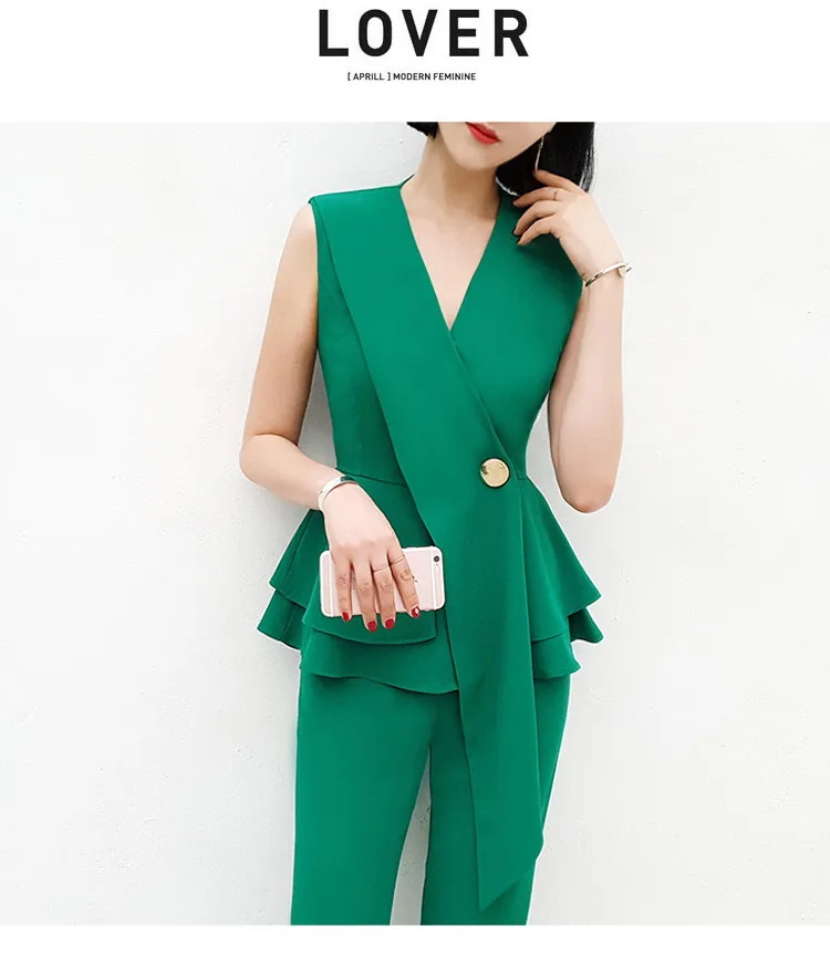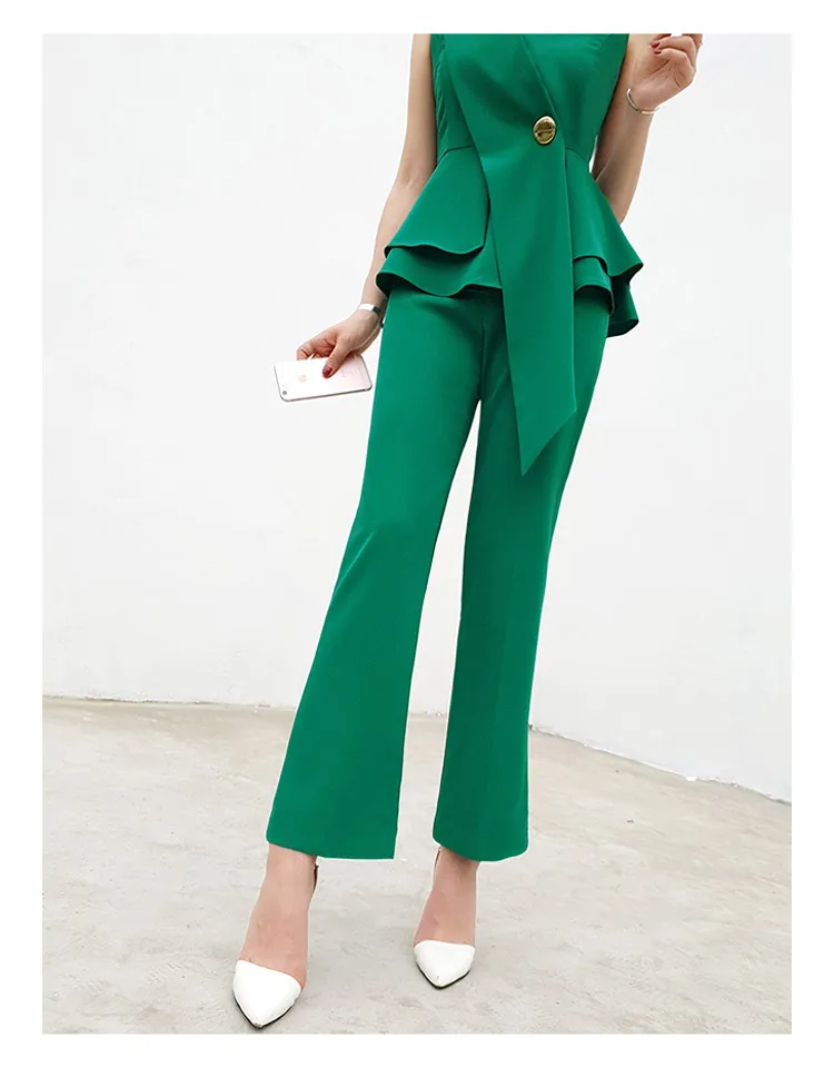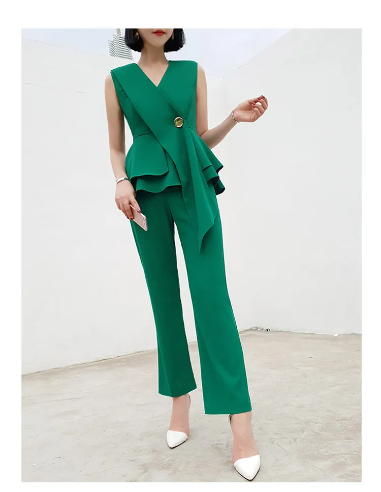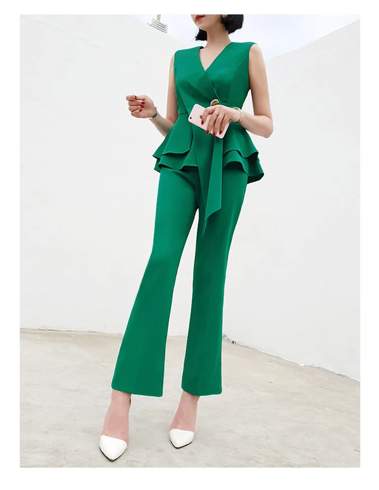 Ladies Summer Green Black Two Pieces Sets Women 2019 New Korean Fashion V-neck Ruffled Shirt