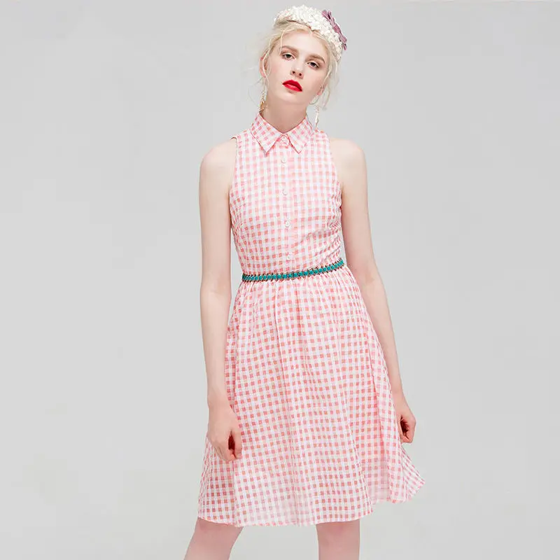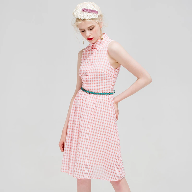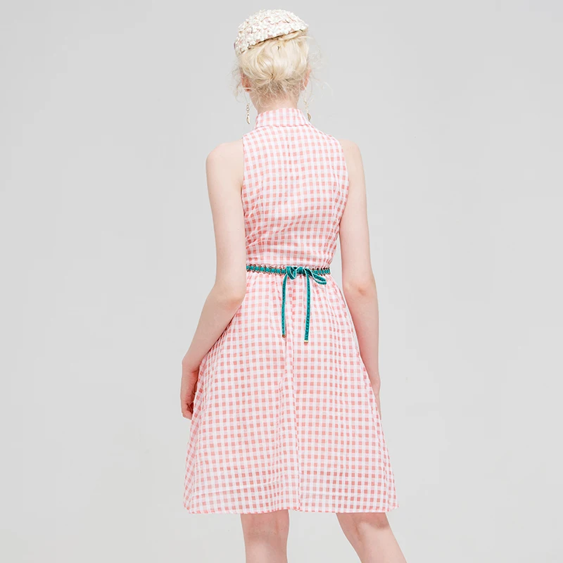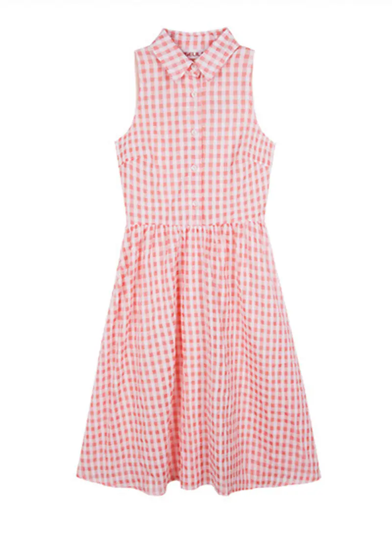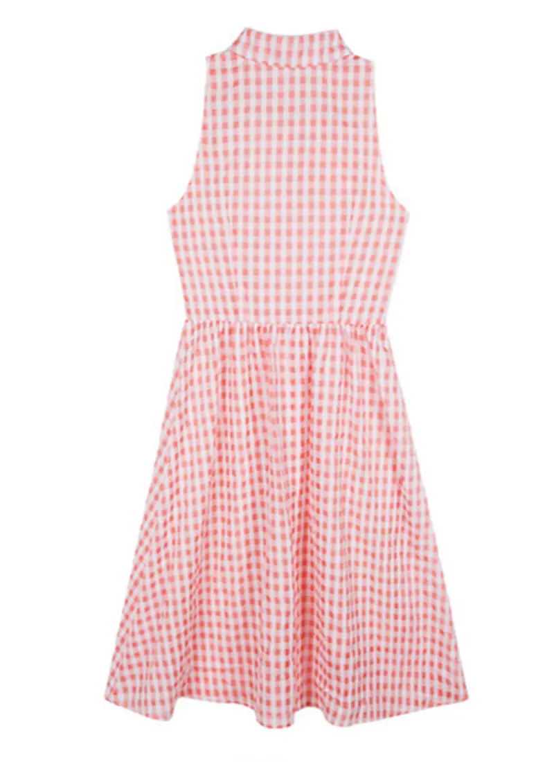 Sexy Pink Plaid Turn-Down Collar Women Sleeveless Botton Elegant Night Club Body con Party Dresses